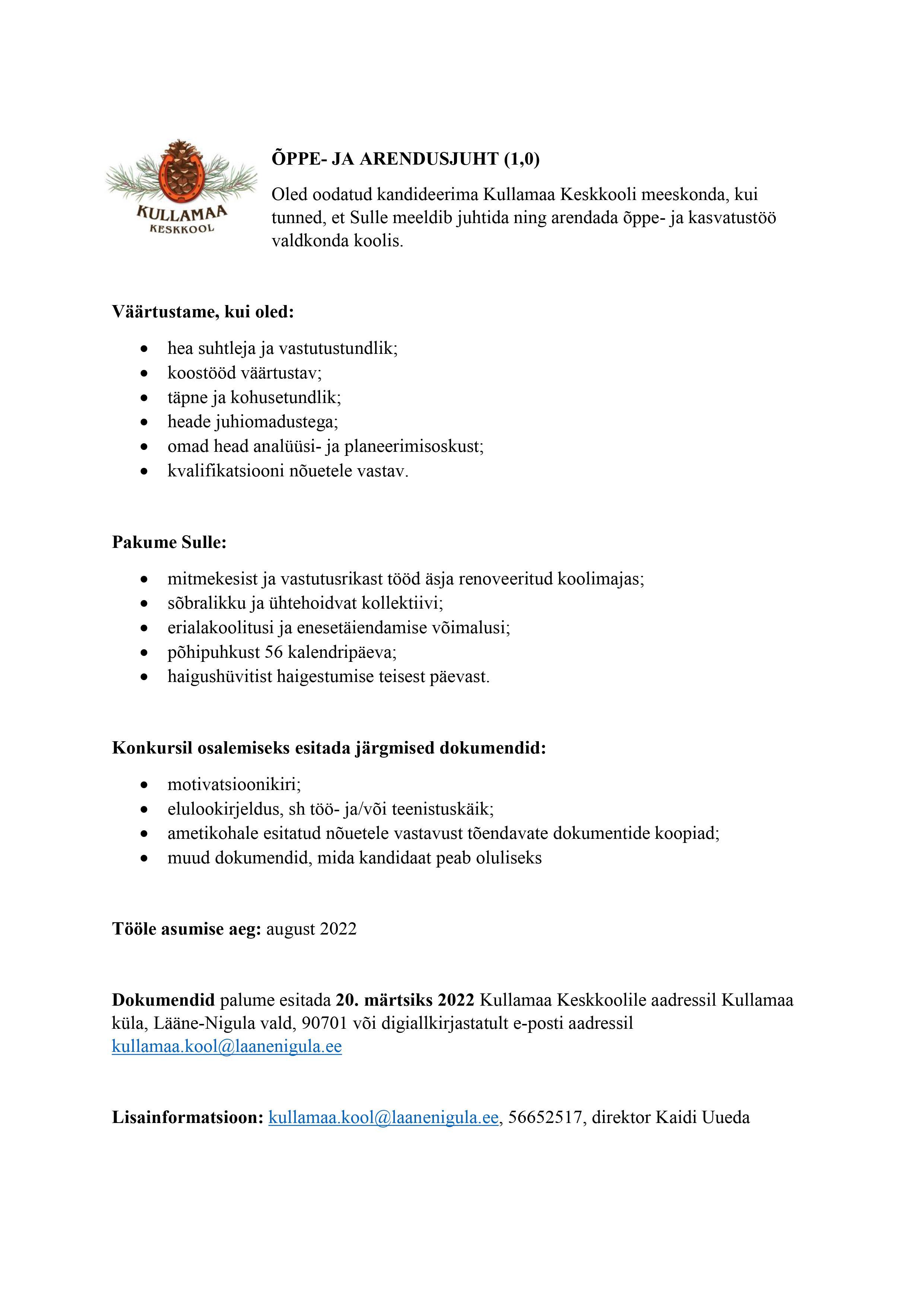 Oled oodatud kandideerima Kullamaa Keskkooli meeskonda, kui tunned, et Sulle meeldib juhtida ning arendada õppe- ja kasvatustöö valdkonda koolis.